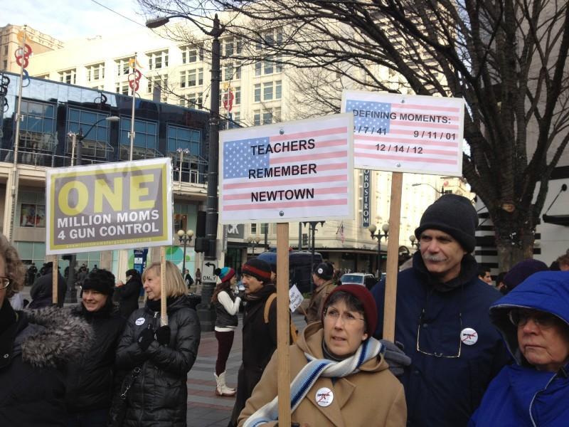 Sign at Seattle rally reads "NRA money corrupts democracy"